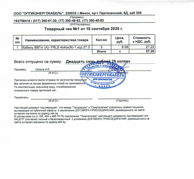 Продавец – ООО «ОПТИКЭНЕРГОКАБЕЛЬ» (адрес месторасположения: 220033, Республика Беларусь, г.Минск, пр. Партизанский, д.6Д, каб.305).